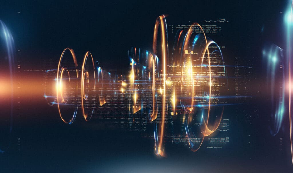 Abstract digital visualization showing glowing concentric rings and flowing data streams, representing advanced quantum-resistant cryptography and futuristic cybersecurity technology.